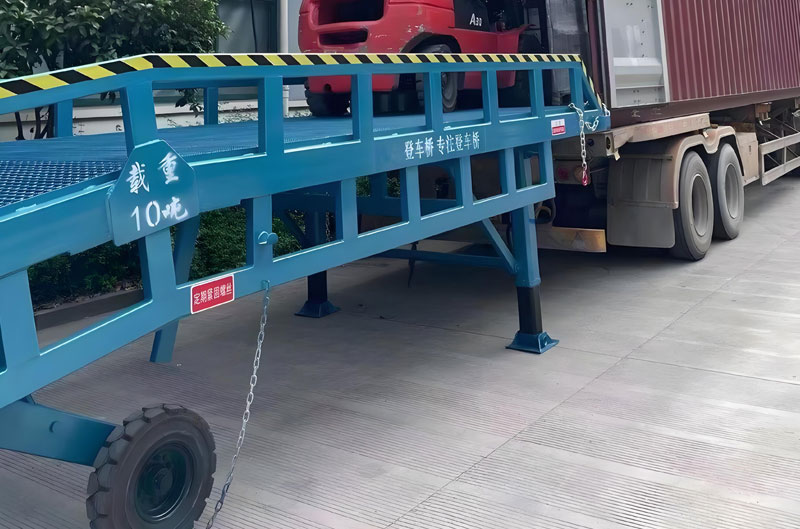1、調(diào)節(jié)移動(dòng)式登車橋高度,使移動(dòng)式登車橋的唇板和貨車車廂搭接。