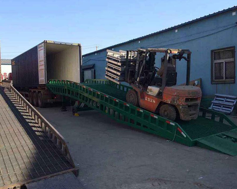 三、進(jìn)行登車作業(yè)前,應(yīng)先檢查登車橋各部位有無異常。再將登車橋置于空闊、安全的場(chǎng)所,和相應(yīng)需裝卸的貨柜、車進(jìn)行安全對(duì)接好以后,在貨車車輪下方墊好安全三角木。